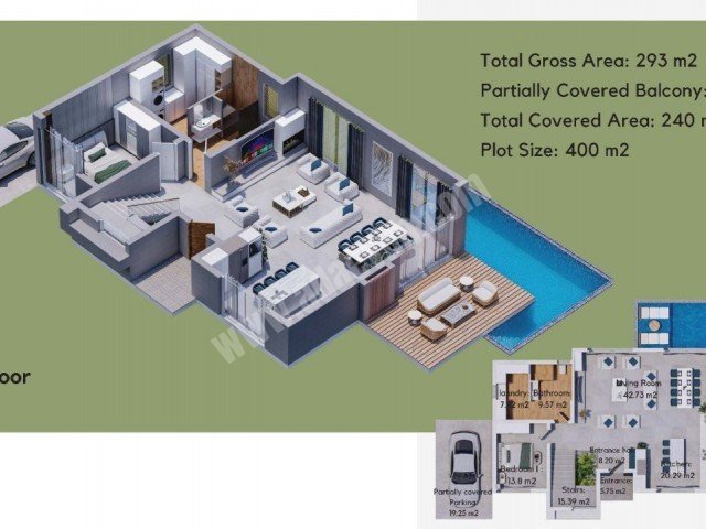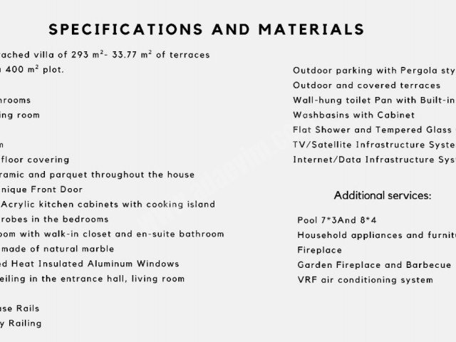 - 4+1 Villa: 400 m² arsa, 240 m² kapalı alan, 16 m² kapalı teras, 34 m² pergolalı teras